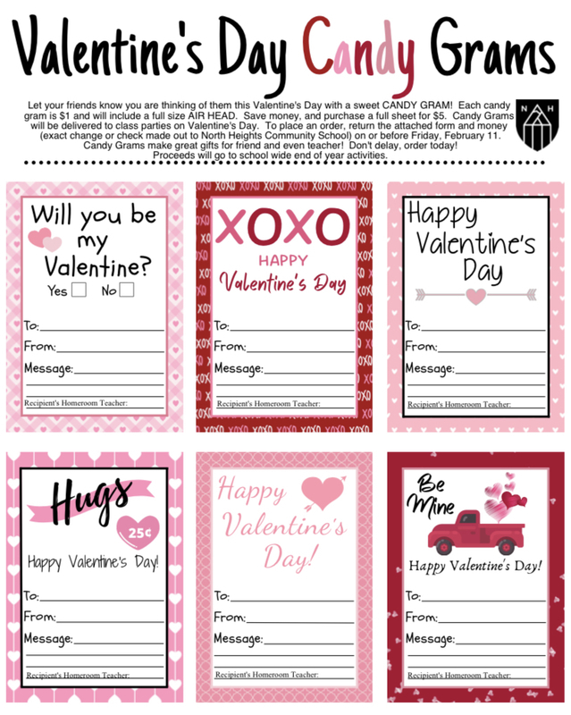 Let your friends know you were thinking of them this Valentine’s Day with a sweet CANDY GRAM! Each candy gram is $1 and will include a full size AIR HEAD. Save money by purchasing a full sheet for just $5. Candy grams will be delivered to the class parties on Valentine’s Day. To place an order, return the attached form and money (exact change or check made out to North Heights Community School) on or before Friday, February 11.